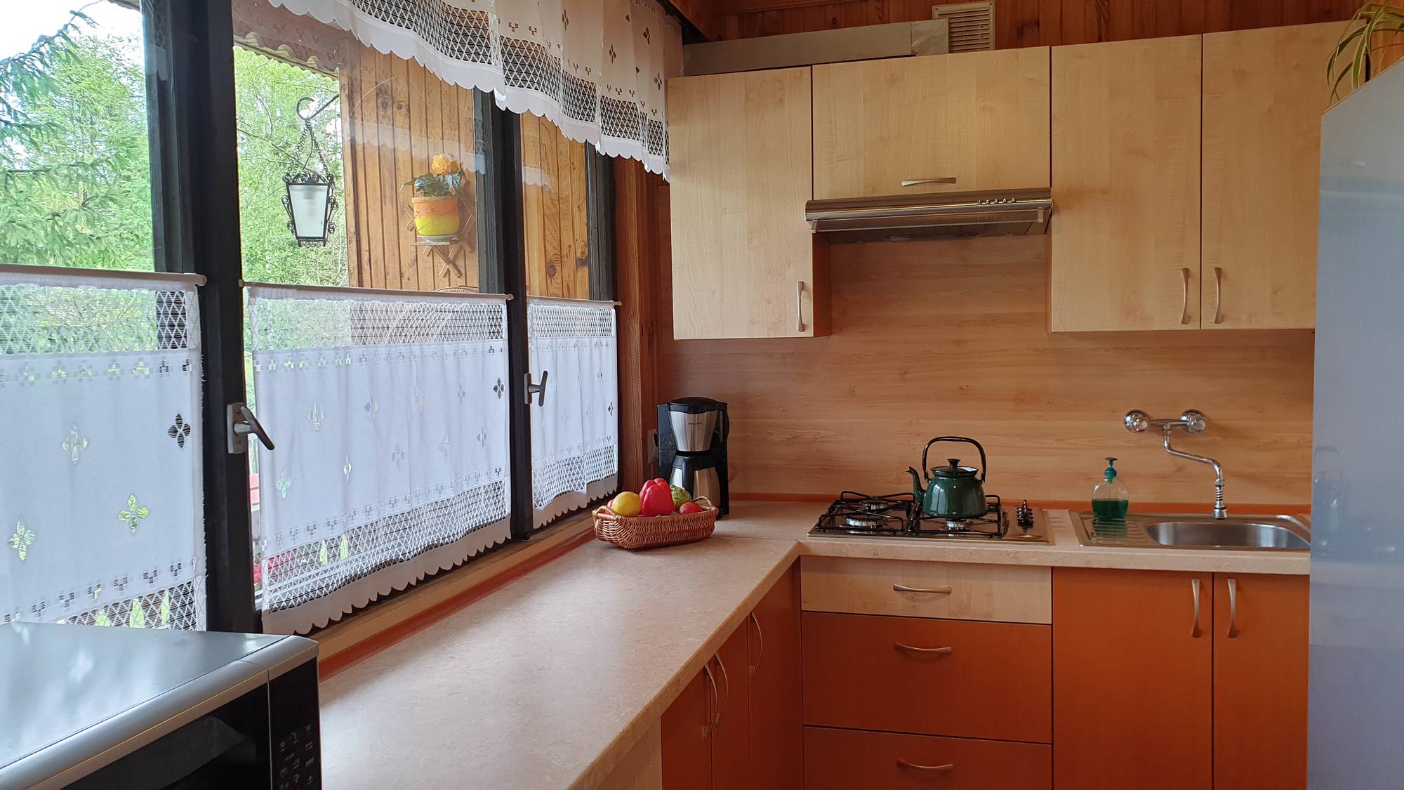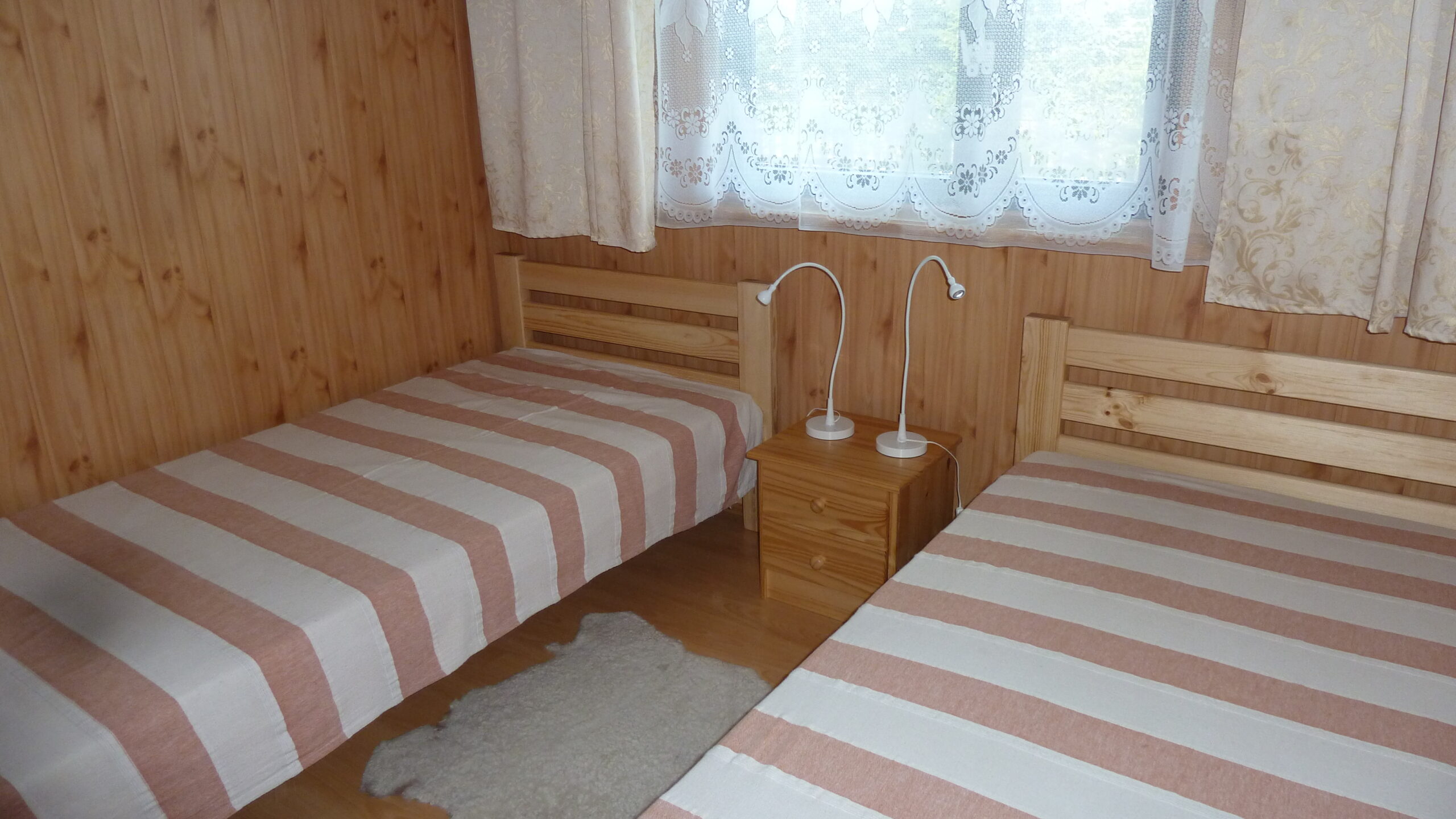 Domek jest piętrowy. Na parterze znajdują się dwa pokoje – jedno- i dwuosobowy , kuchnia oraz łazienka; na piętrze – dwa pokoje dwuosobowe.